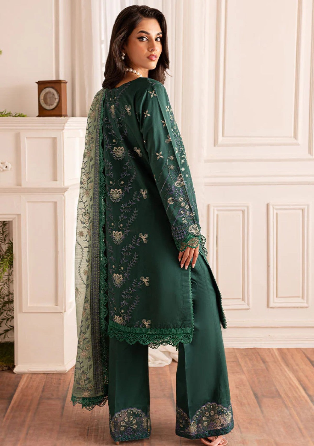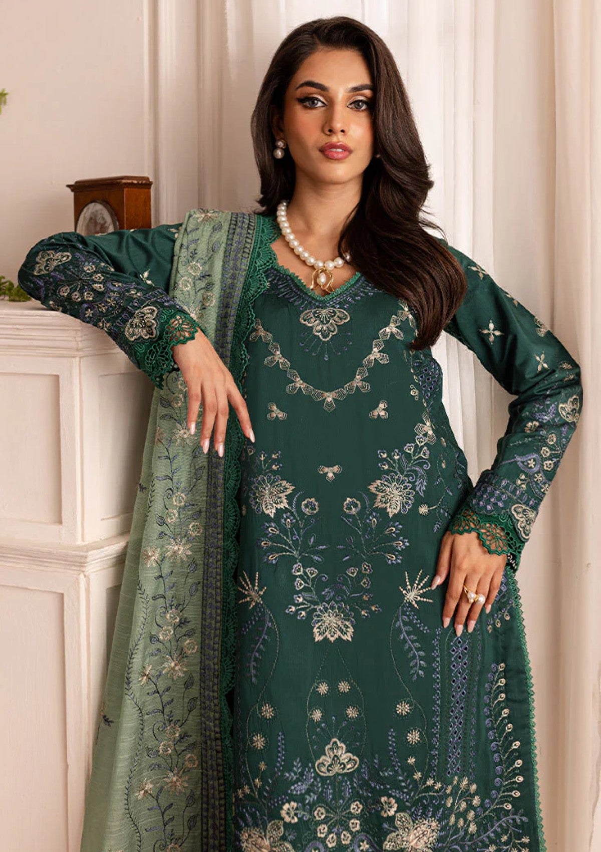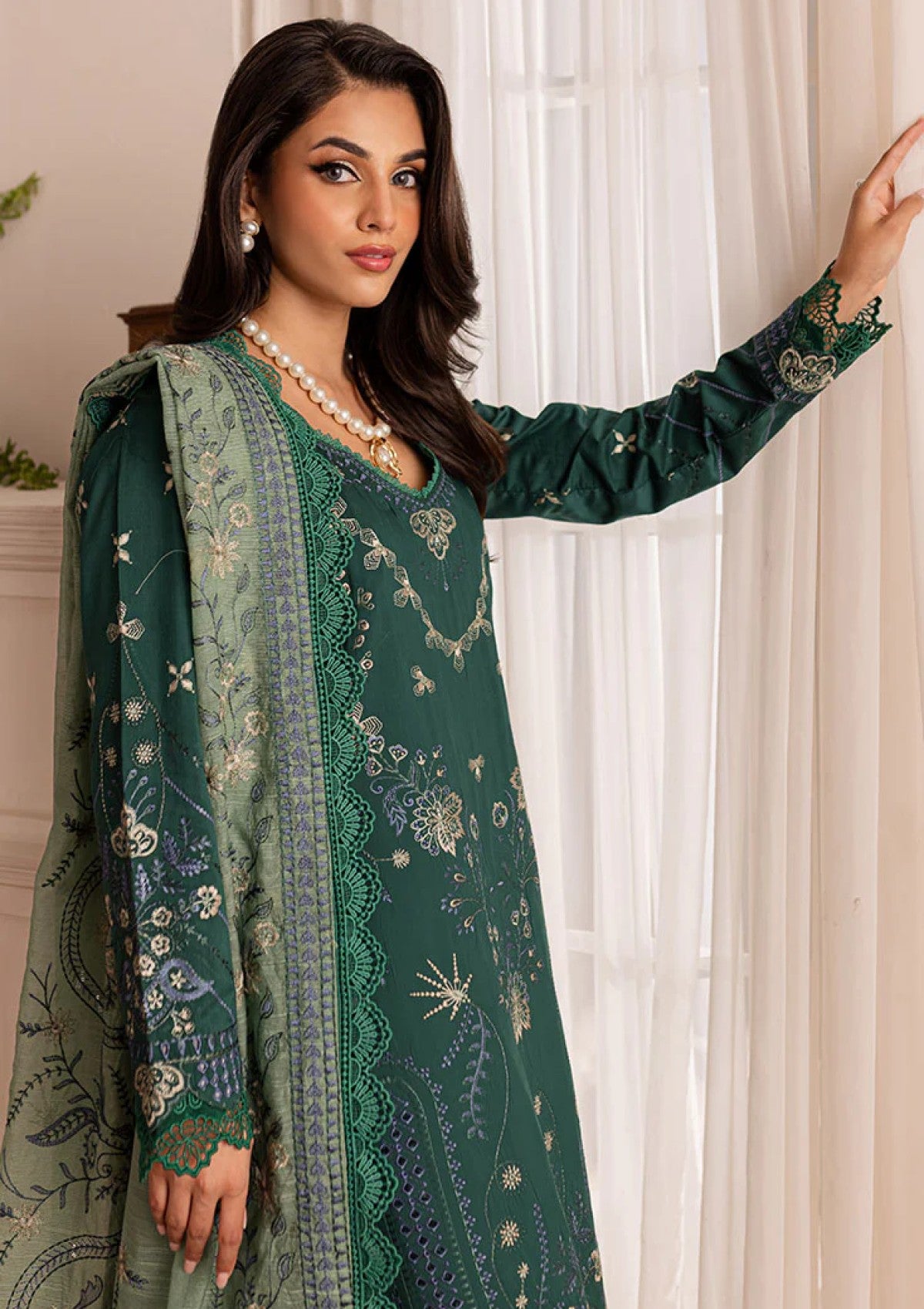A stunning Green outfit from the Serene Embroidered Viscose Collection by Marjjan. The rich shade is complemented with sequins embroidery on the front, back, and sleeves, paired with organza borders and an embellished Cotton Net dupatta. A perfect pick for wedding festivities or formal evenings, offering elegance with sophistication.