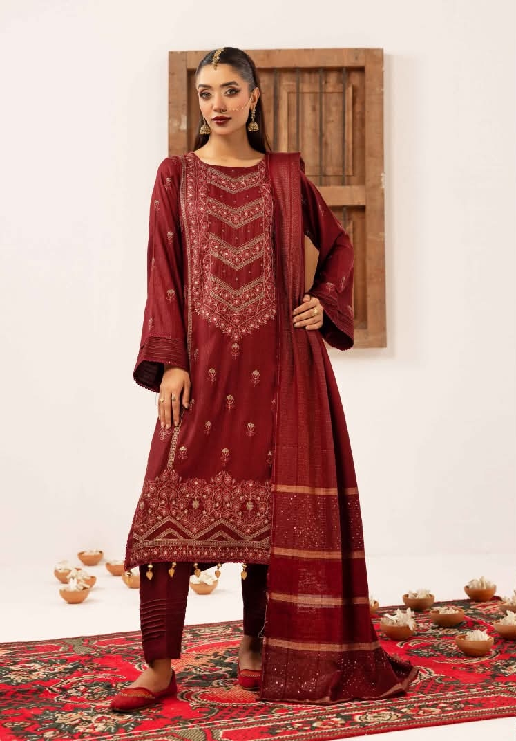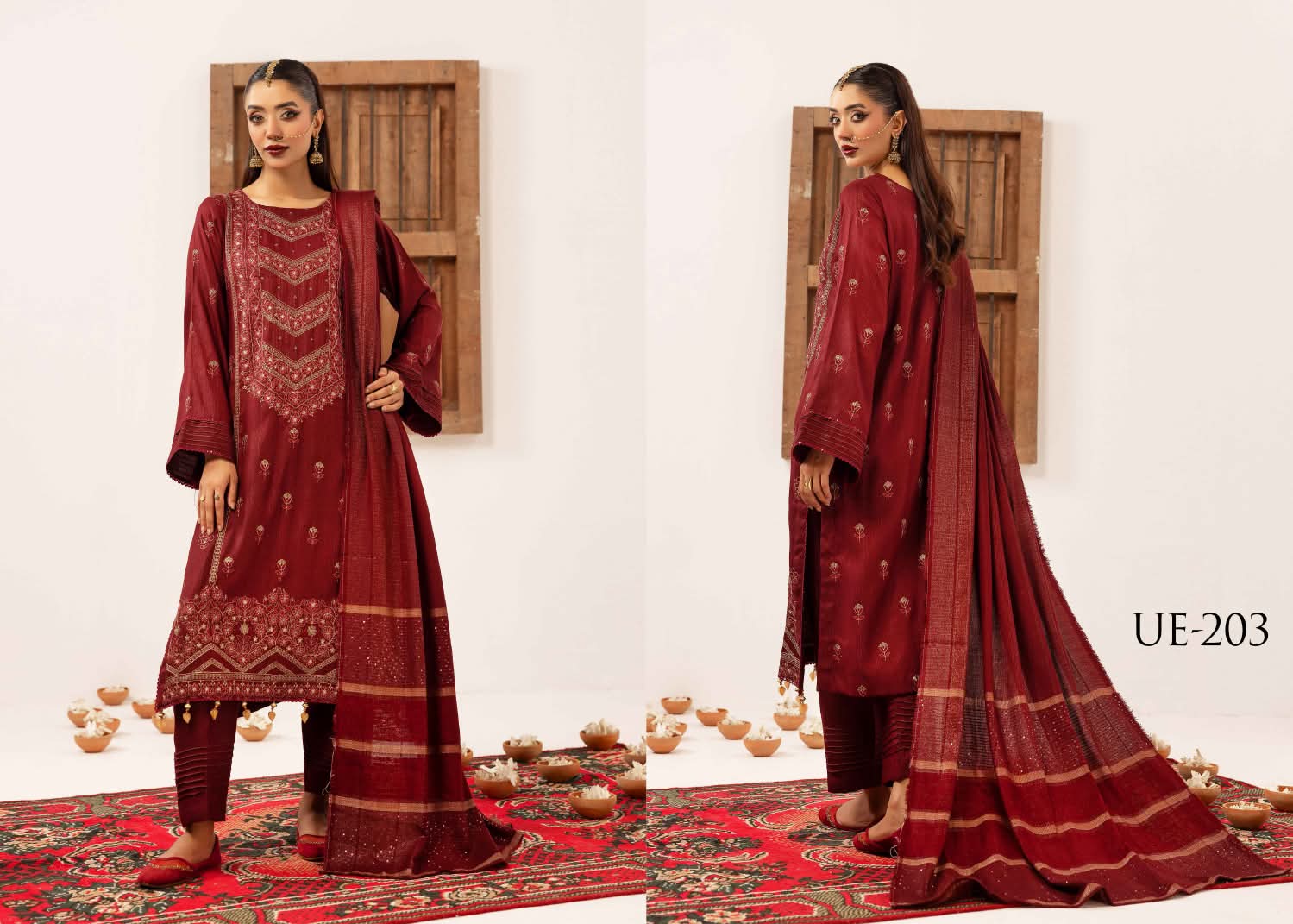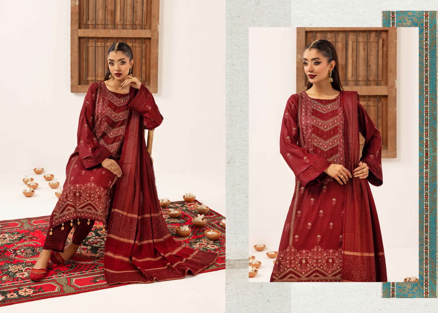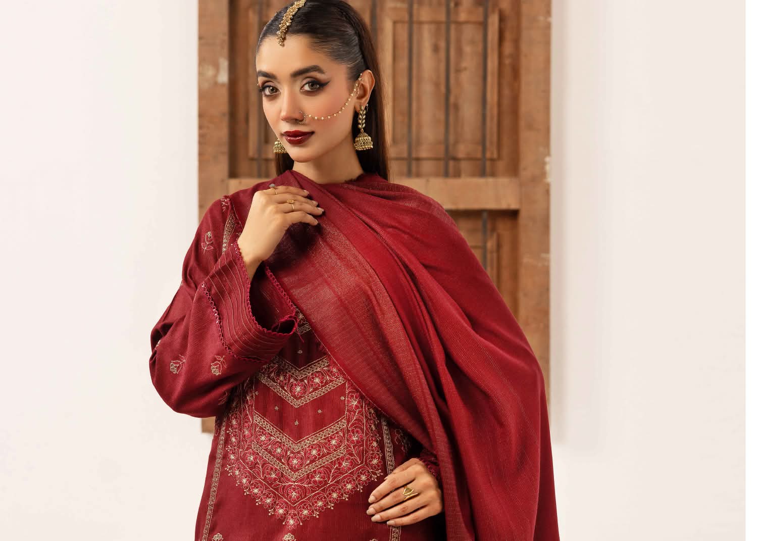 Embrace elegance with Uraan by Nur – an Embroidered Peach Leather Shirt paired with a luxurious Velvet Jacquard Shawl, designed for timeless festive sophistication.