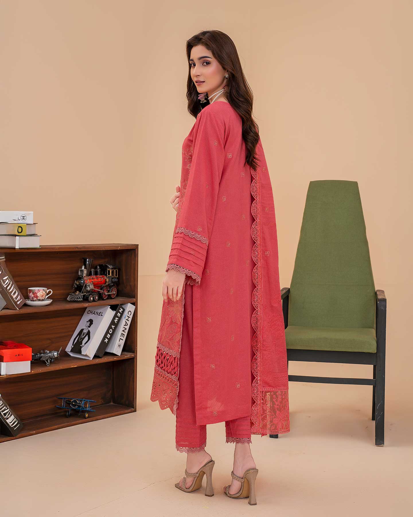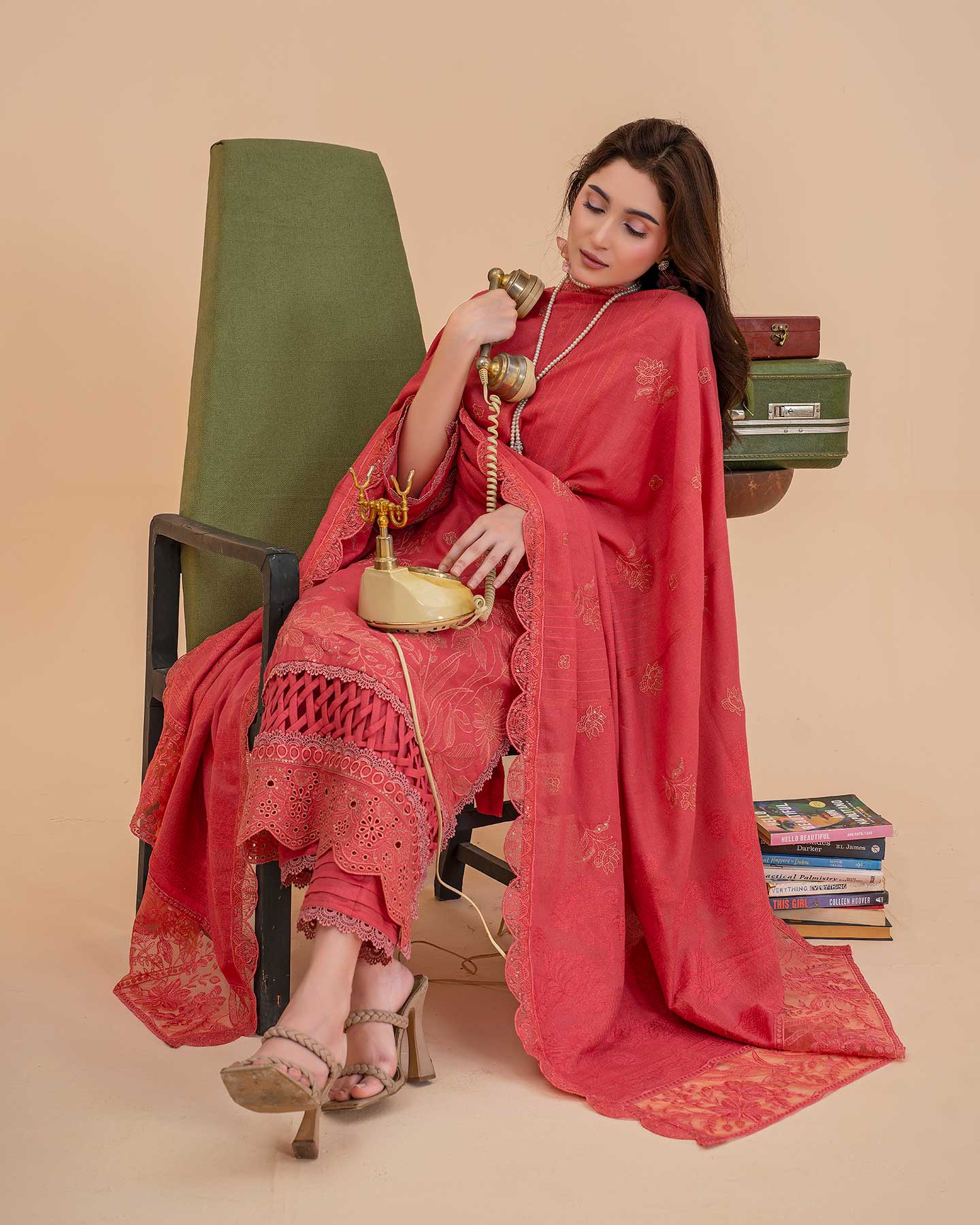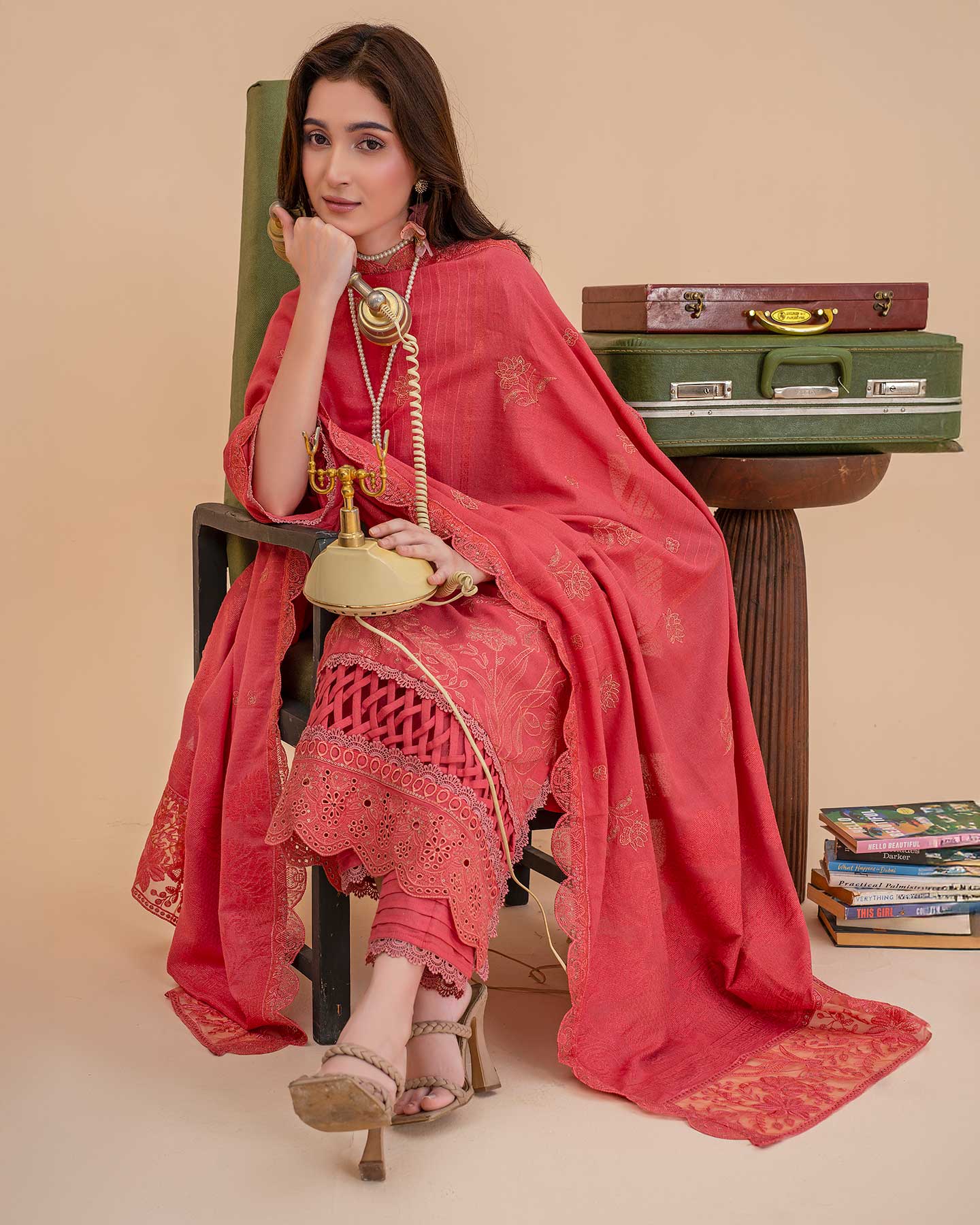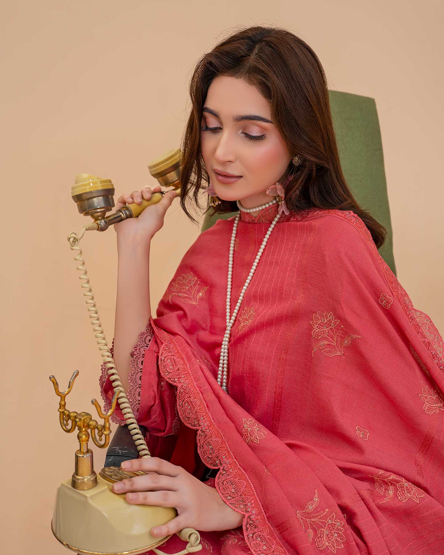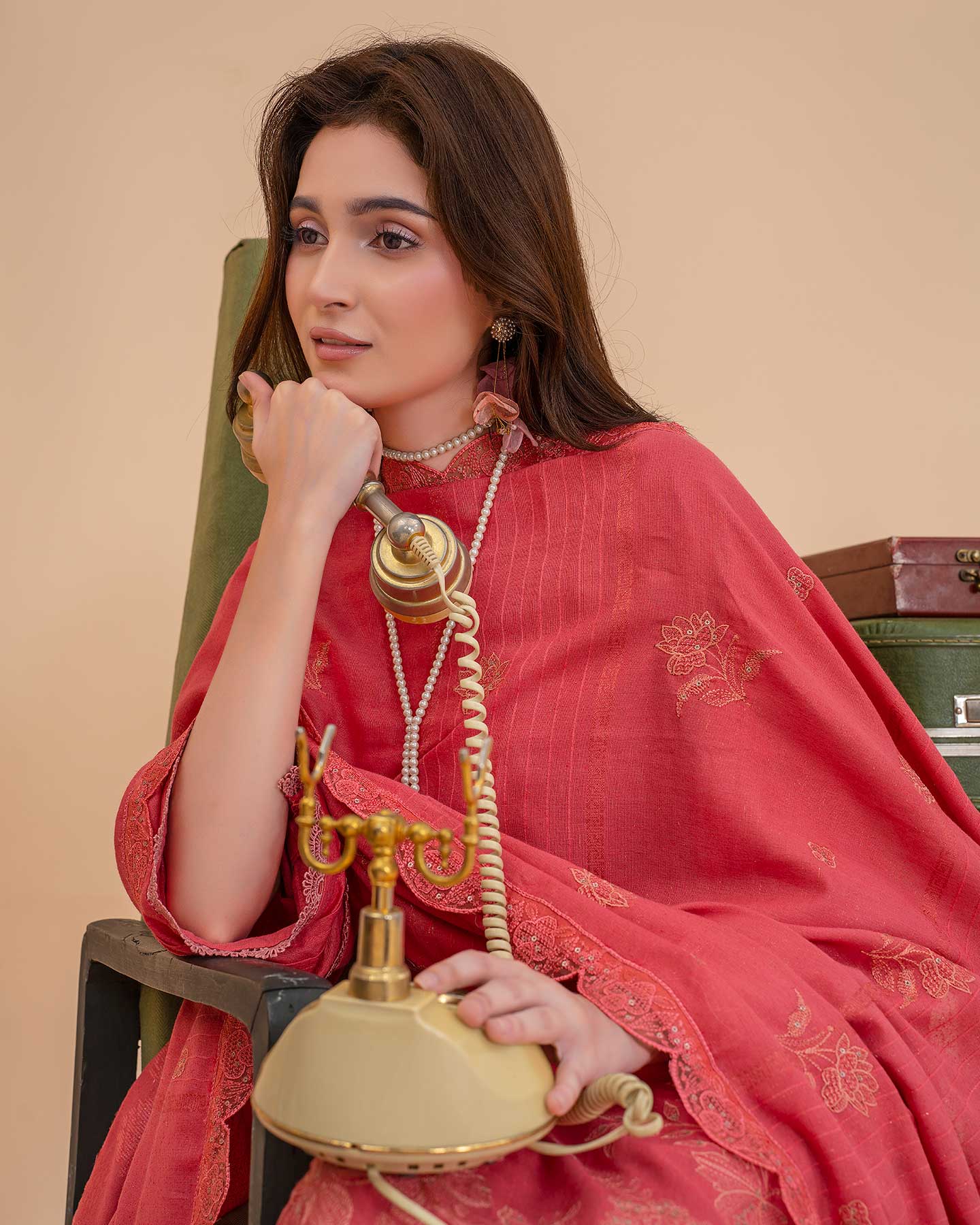 A perfect blend of style and ease – this Zarri Tilla Karandi Shirt with intricate embroidery, complemented by a Fancy Barosha Dupatta with lace detailing , makes your festive look complete.
