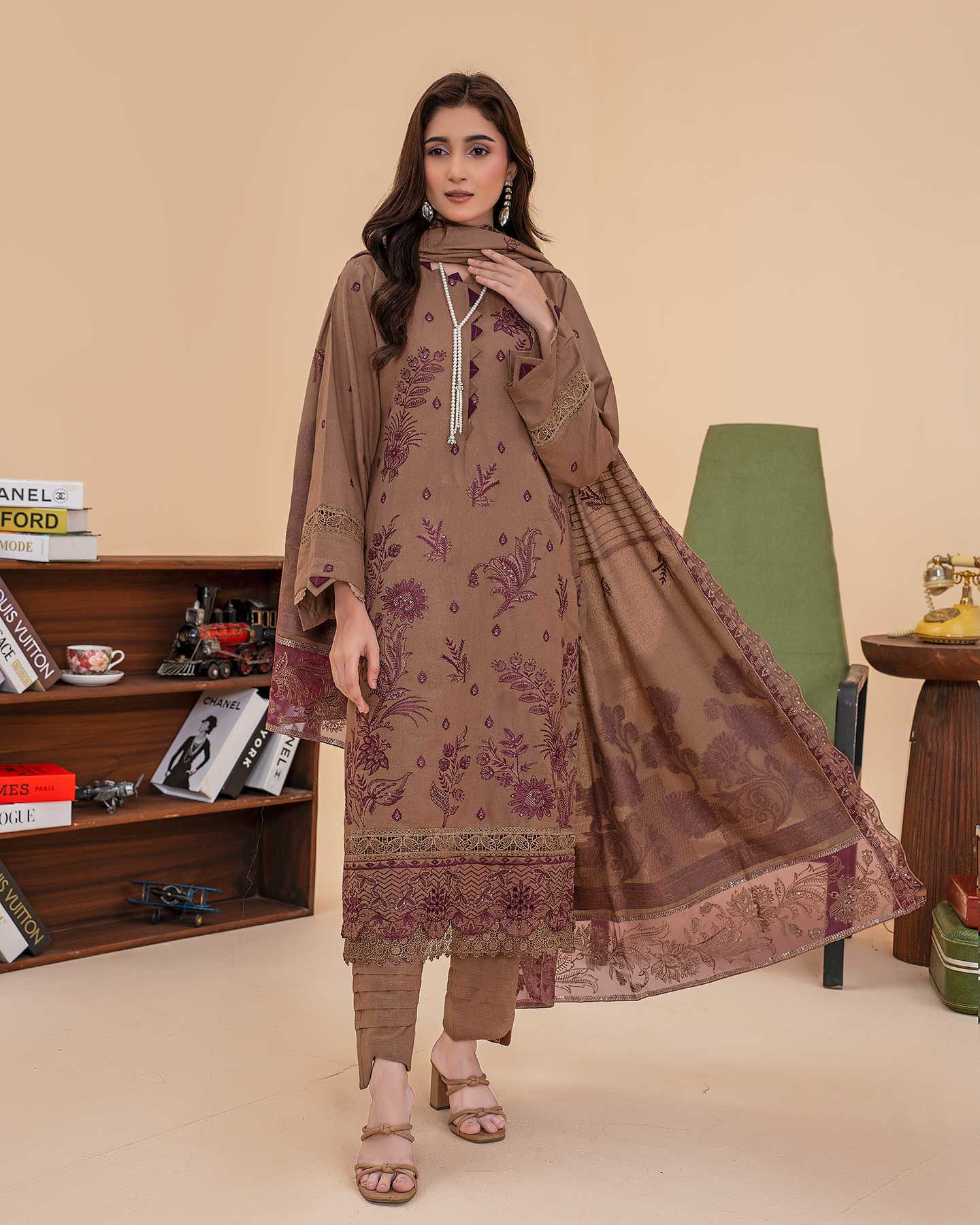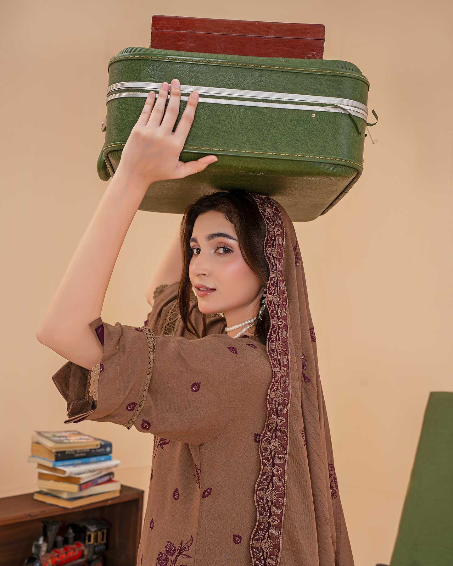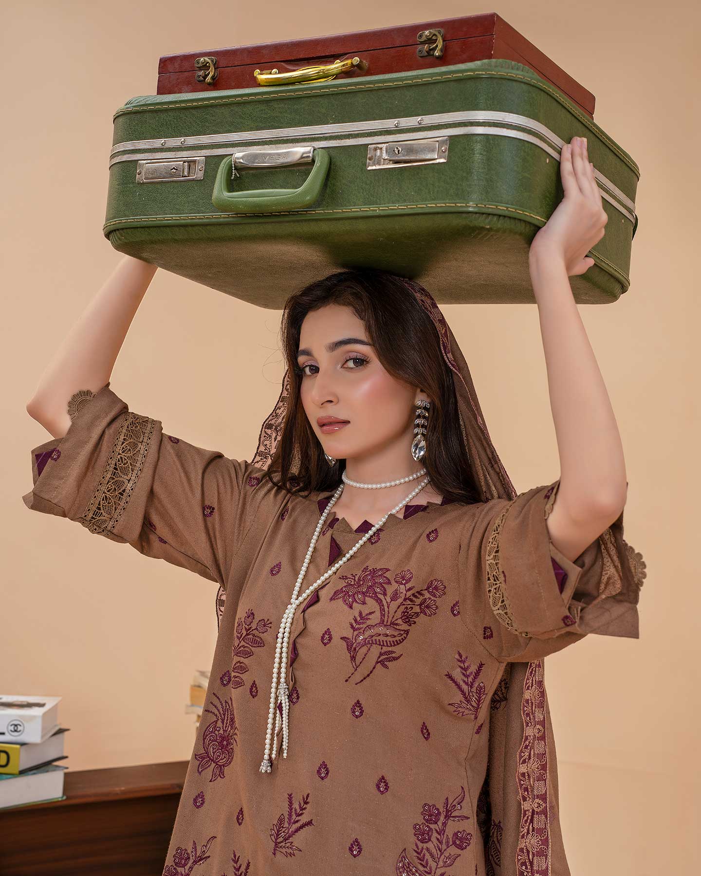 A perfect blend of style and ease – this Zarri Tilla Karandi Shirt with intricate embroidery, complemented by a Fancy Barosha Dupatta with lace detailing , makes your festive look complete.