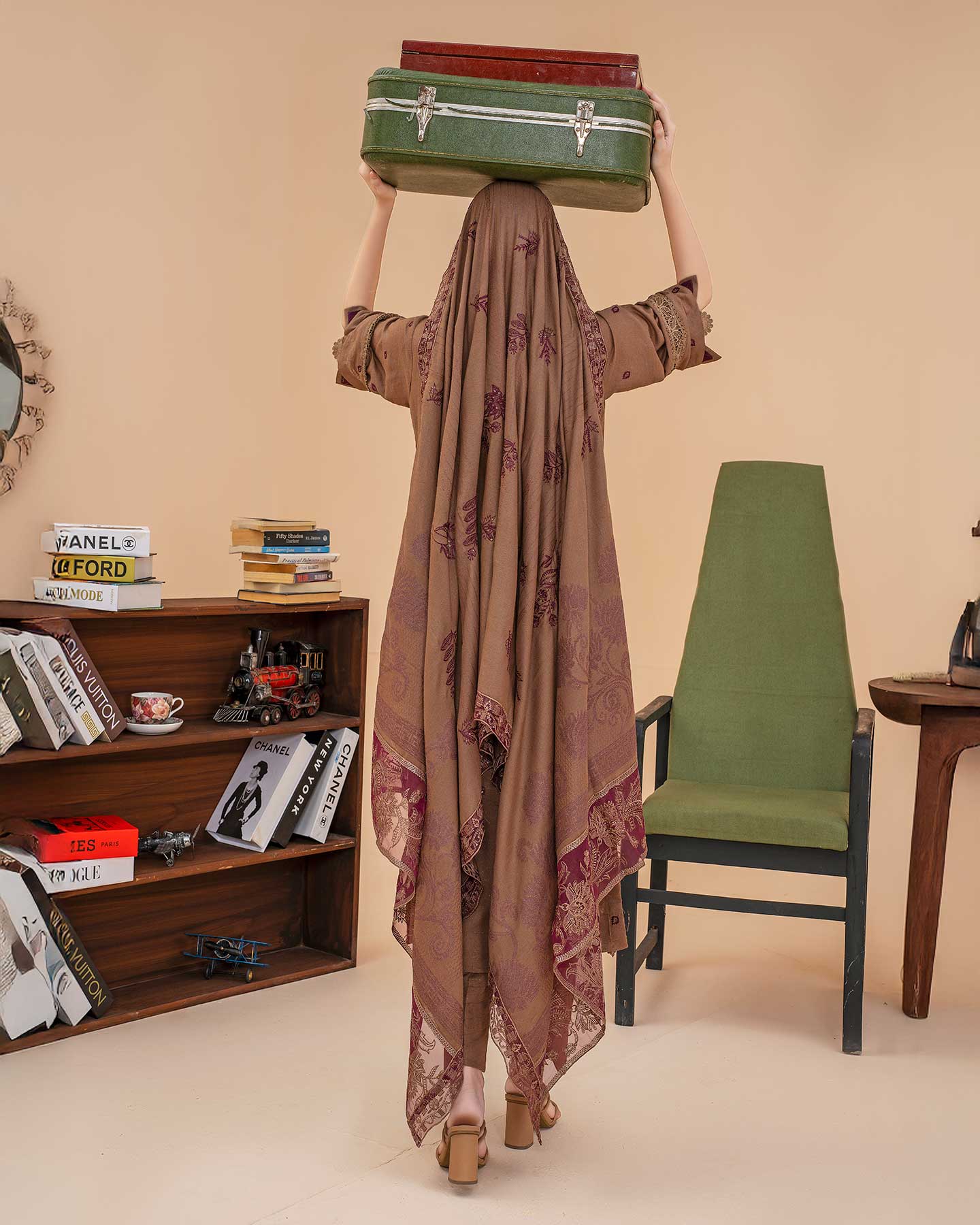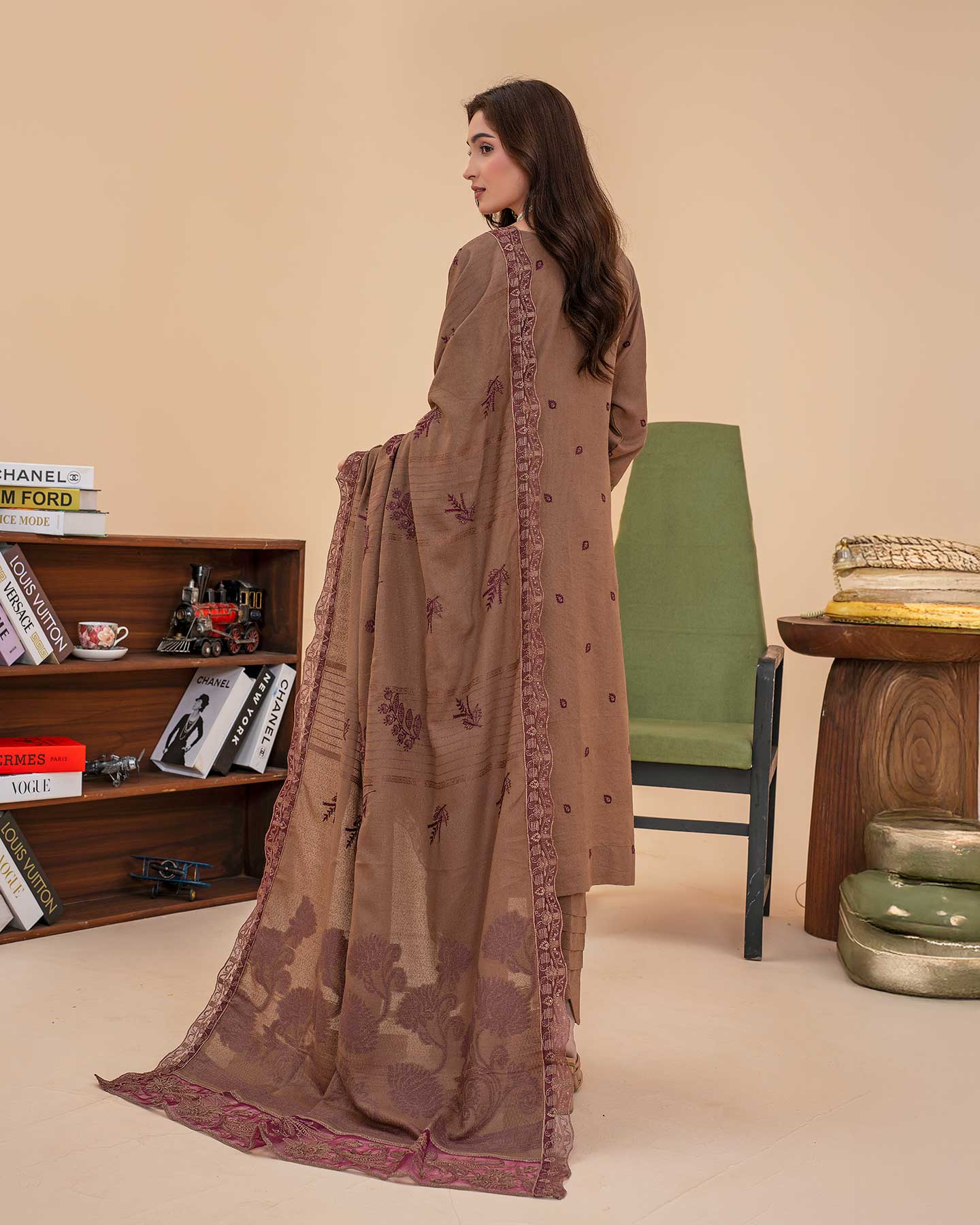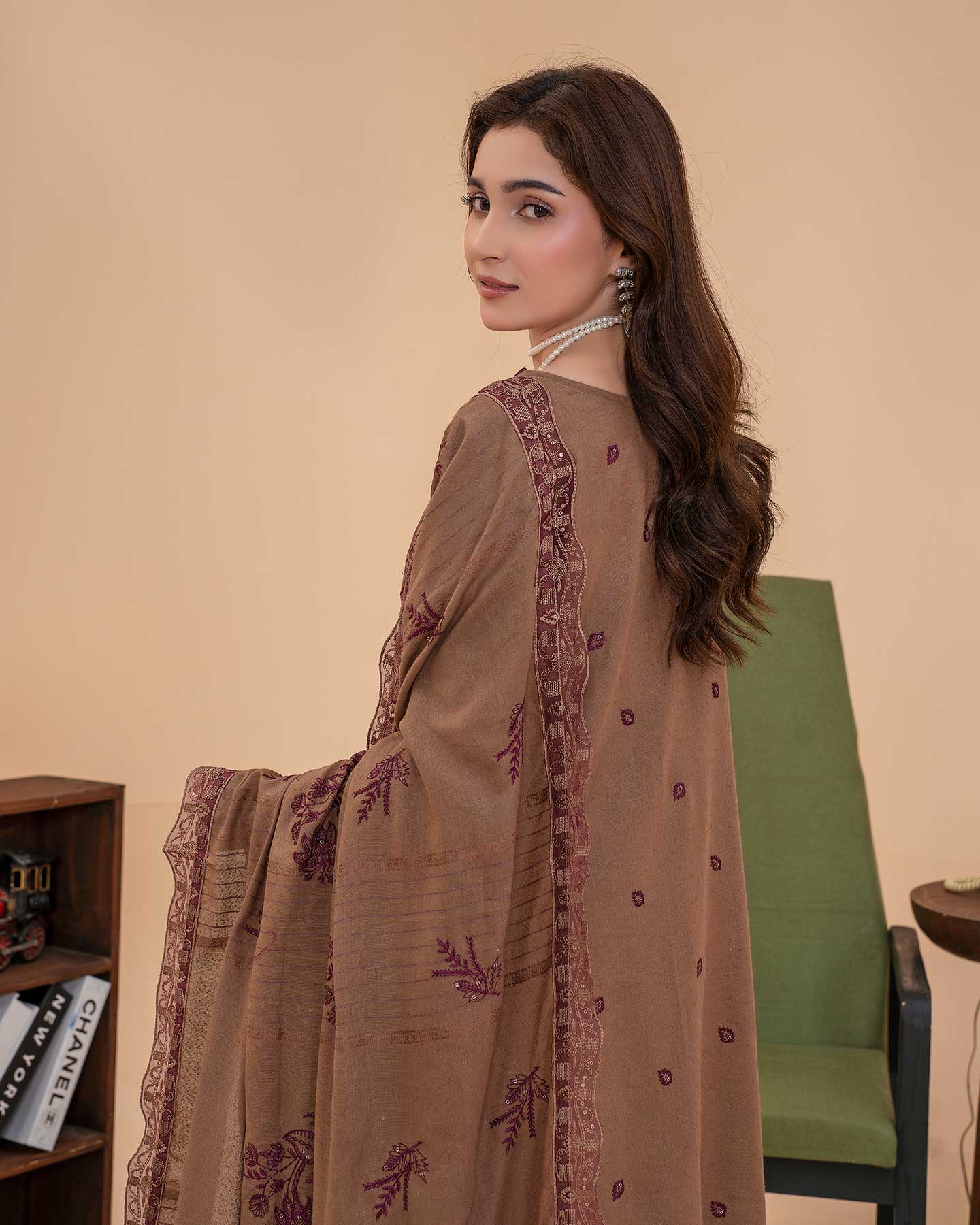 A perfect blend of style and ease – this Zarri Tilla Karandi Shirt with intricate embroidery, complemented by a Fancy Barosha Dupatta with lace detailing , makes your festive look complete.